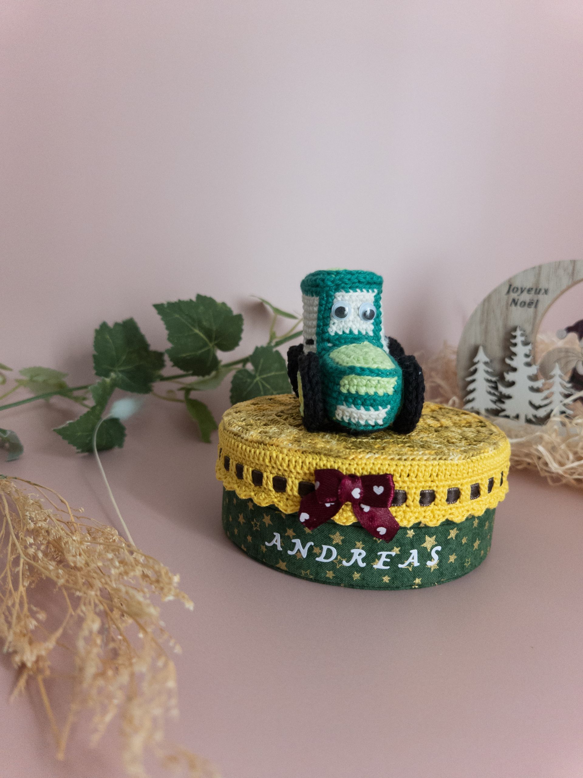 Tout a commencé avec une demande simple mais originale : ma cliente souhaitait un objet fait main, qui mêle tradition et originalité. Son idée ? Un tracteur au crochet pour sont petit garçon Andreas, un clin d'œil à son amour pour la campagne, et une boîte décorative aux tonalités de Noël pour illuminer les fêtes. Un défi stimulant que j'étais ravie de relever !
